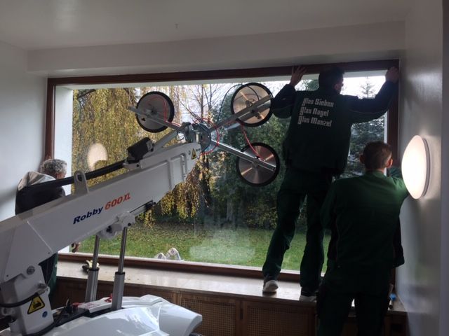 Mit unserem Glasroboter und unserem Glaslift können wir auch große Glasscheiben an schwer zugänglichen Orten einsetzen und Kranarbeiten selbst durchführen. Dadurch sparen Sie Kosten beim Einbau von großen Scheiben in oberen Etagen.